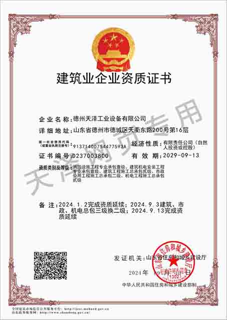 德州天澤工業(yè)設(shè)備有限公司成立于2003年(前身為德州天元集團(tuán)天明工業(yè)設(shè)備安裝公司),經(jīng)過20多年的發(fā)展,現(xiàn)成長為擁有職工600余人,各類專業(yè)技術(shù)人員近300余人,年生產(chǎn)能力兩億元以上,以建筑機(jī)電安裝工程、消防設(shè)施安裝工程施工為主,集建筑工程施工、市政工程施工、建筑智能化工程施工、園林綠化工程施工、工程管理服務(wù)、物業(yè)管理、電氣機(jī)械設(shè)備銷售等多元化經(jīng)營于一體的綜合型企業(yè)。2005年,企業(yè)按照國際標(biāo)準(zhǔn)建立的質(zhì)量管理體系,通過了ISO質(zhì)量管理體系認(rèn)證、環(huán)境管理體系認(rèn)證、職業(yè)健康安全管理體系認(rèn)證。施工工程遍布山東、河北、四川、江蘇等地,最具代表性的工程有:山東省德州市百腦匯資訊廣場機(jī)電安裝工程、德州經(jīng)濟(jì)開發(fā)區(qū)天元大廈機(jī)電安裝工程、陵城區(qū)人民醫(yī)院機(jī)電安裝工程、德州金魯班大廈機(jī)電安裝工程、河北故城金辰小區(qū)機(jī)電安裝工程、北川地震災(zāi)后援建工程等。多年來,公司始終堅持“以人為本,建精品工程,創(chuàng)行業(yè)品牌”的經(jīng)營理念,先后榮獲省(市)級泰山杯、天府杯、魯安杯等獎項,申報各種功法、多項專利。